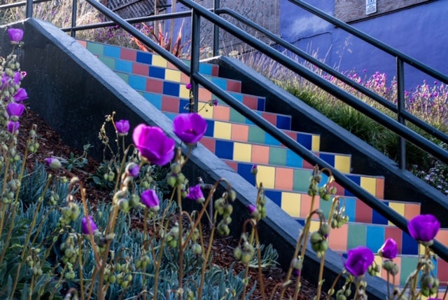 Once a trash-covered hillside, San Francisco’s Tompkins Stairway Garden is now a safe and welcoming street park, featuring a drought-tolerant garden in year-round bloom and a colourful tiled stairway. Dedicated attention from surrounding neighbours has transformed the site into a community greenspace and pedestrian corridor serving the Alemany Farmers’ Market and nearby schools and shopping districts. The San Francisco Chronicle calls the new garden “stunning,” “gorgeous,” and a “cheerful splash of public art that will probably become a photo hot spot.” In addition, San Francisco Beautiful honoured it with the 2019 Placemaking Award for creating a sense of identity in a public space. The stairs link Tompkins Avenue between Nevada and Putnam Streets in southeast Bernal Heights. The next time you’re in the neighbourhood, stop by!